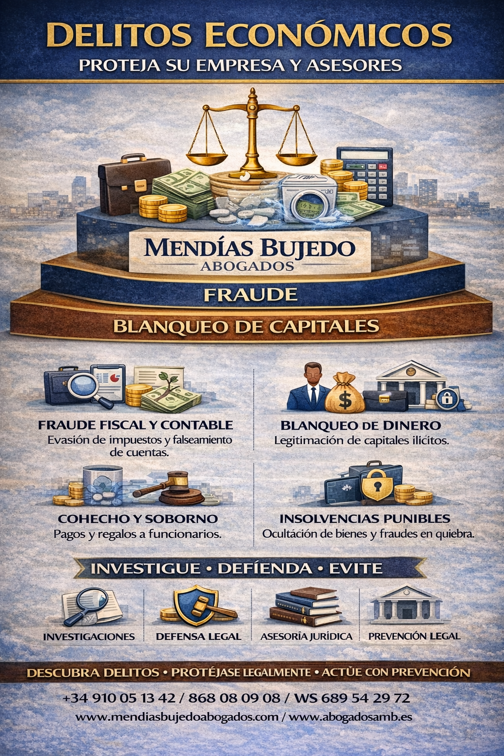 Los delitos económicos abarcan una variedad de actividades delictivas que pueden afectar a personas y empresas. En MENDÍAS BUJEDO ABOGADOS, nuestro enfoque se centra en brindar una defensa sólida y estratégica para aquellos acusados de delitos económicos, incluyendo malversación, blanqueo de capitales y más.